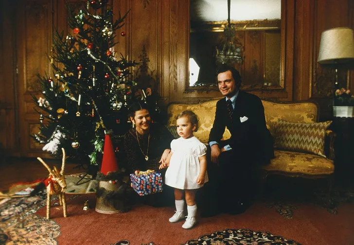 Stockholm, 1979: koning Carl Gustaf en koningin Silvia met babyprins Carl Philip bij de kerstboom.