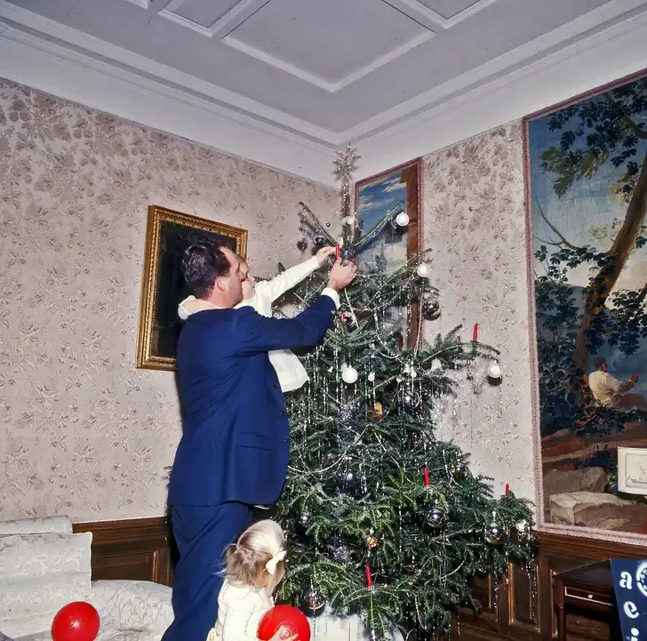 Paleis Zarzuela, 1963: prins Juan Carlos helpt zijn jongste dochter met het optuigen van de boom.