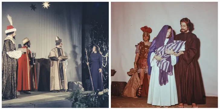 Koninklijk Paleis op de Dam, 1961: prinses Beatrix in blauw is Eva (huh?) in het kerstspel Ster van Bethlehem. Prinses Margriet was destijds de leading lady, als Maria. Toegegeven, geen kerstboom te zien, maar te leuk om toch niet weer even te laten zien.