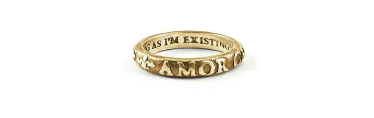 En aan de binnenkant staat: 'As long as I'm existing, you will be loved', woorden geïnspireerd op een Engelse ballade uit de Middeleeuwen. De ring wordt met de hand gemaakt en kost 975 euro.