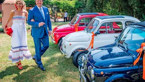 11. Een stralend koningspaar bij de klassieke Italiaanse Fiat'jes in rood-wit-blauw.