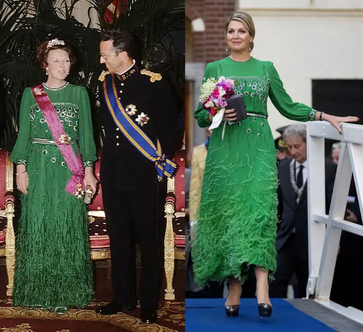 Ook Máxima leent wel eens wat van haar schoonmoeder. Vooral capes, maar in 2004 ook deze jurk die duidelijk maakte dat de koningin echt een stuk langer is dan Beatrix.