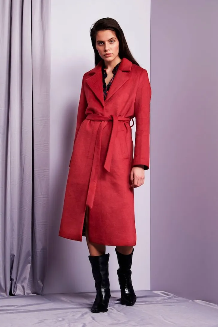 Een prachtige lange jas met strik en een iets uitlopende mouw
