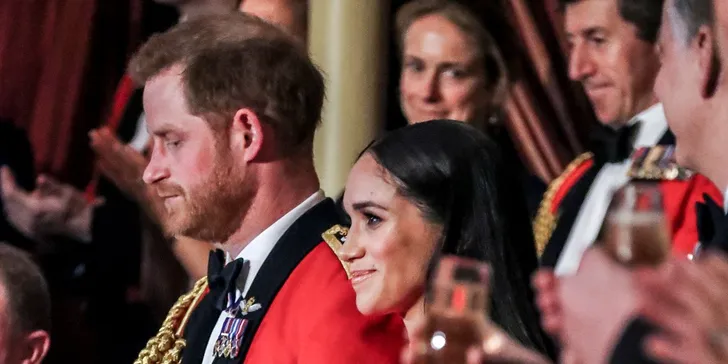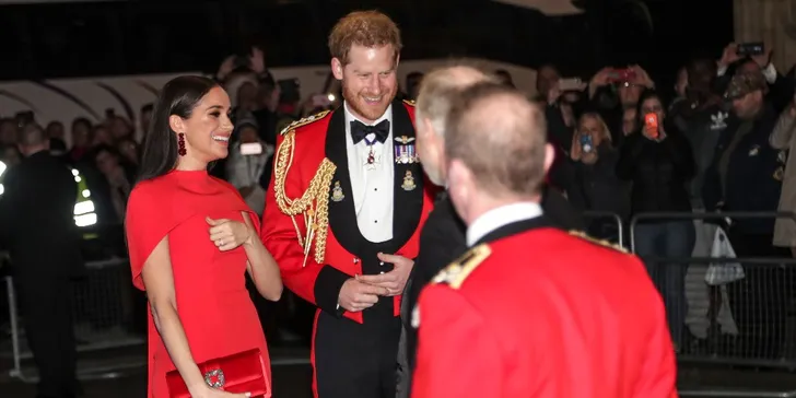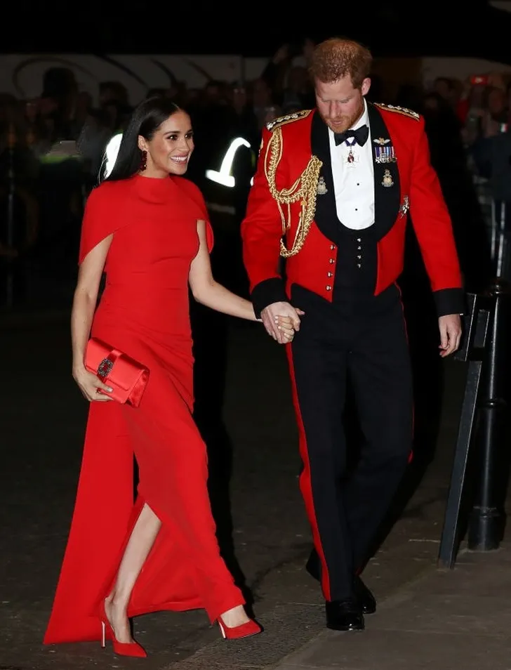 Hertogin Meghan droeg een rode Safiyaa met de sterke schouderpartij waar ze zo'n fan van is. Erbij schoenen van Aquazurra, de Capri clutch van Manolo Blahnik en oorbellen van Simone Rocha. En prins Harry droeg het uniform van Captain General of the Royal Marines (en leek zo zijn bedenkingen te hebben bij de hakken van zijn vrouw).