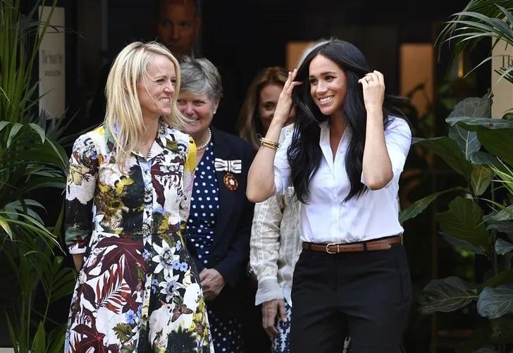 Meghan had zich gekleed in kledingstukken uit de Smart Set collectie, zoals een blouse van haar vriendin Misha Nonoo en een Jigsaw broek...