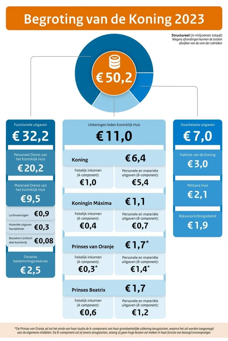 De uitkering bestaat uit een inkomensdeel en een deel voor ‘personele en materiële uitgaven’. Het salaris van de koning komt uit op 1.035.000 euro. Dat is 2,8 procent meer dan hij dit jaar ontvangt. Ook de royals voelen dus de gevolgen van de inflatie, die dit jaar naar verwachting op 10 procent uitkomt.