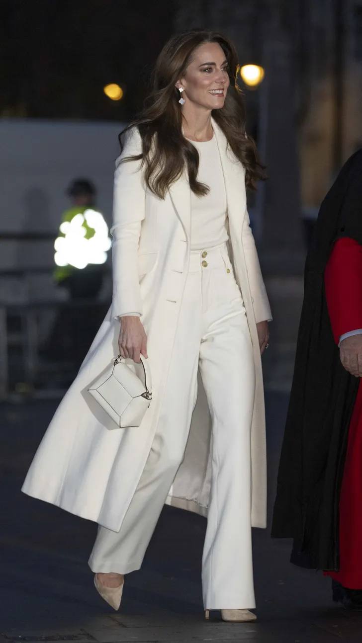 Kate droeg een mooi off-white ensemble met een broek van Holland Cooper en een jas van Chris Kerr Bespoke Tailor.