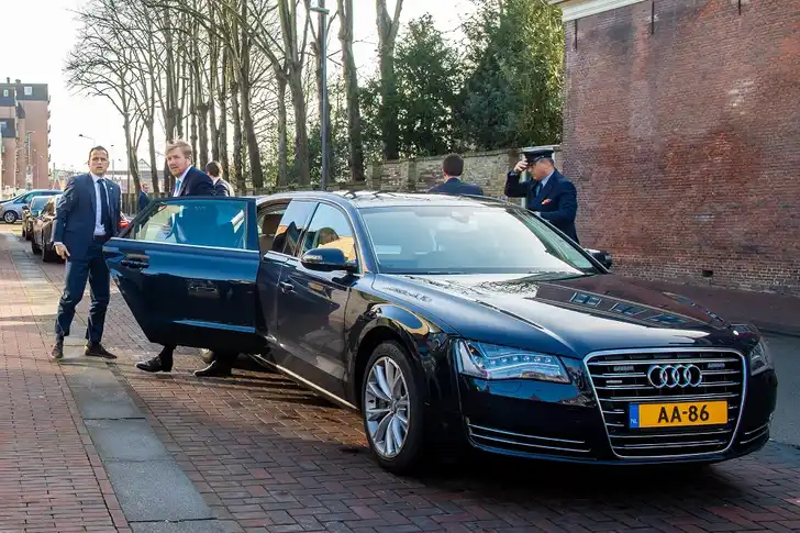 De dienstauto van de koning is een Audi A8 L, die met 45 cm verlengd is om hem meer beenruimte te geven. De toch al lange auto komt daarmee op 5,72 meter wat een behoorlijk formaat is. Er past wel een koelbox, digitale tv, massagestoelen, multimedia-schermen en privacyglas in, en een raam waarmee hij zich kan afsluiten van de chauffeur. Het is echter een diesel, dus dat levert geen bonuspunten op qua groen-moet-je-doen. De Tesla waarin het privé wel eens werd gesignaleerd is al een tijdje niet meer gespot.