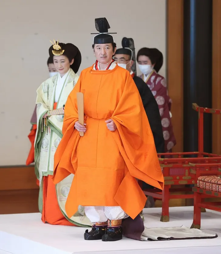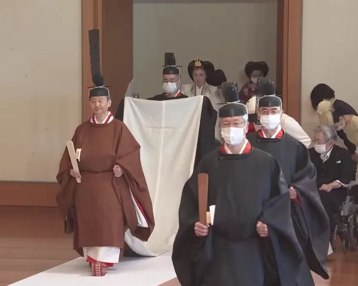 Bij het ritueel doken vele mondkapjes op, behalve dan bij de hoofdrolspelers. Dit is keizer Naruhito…