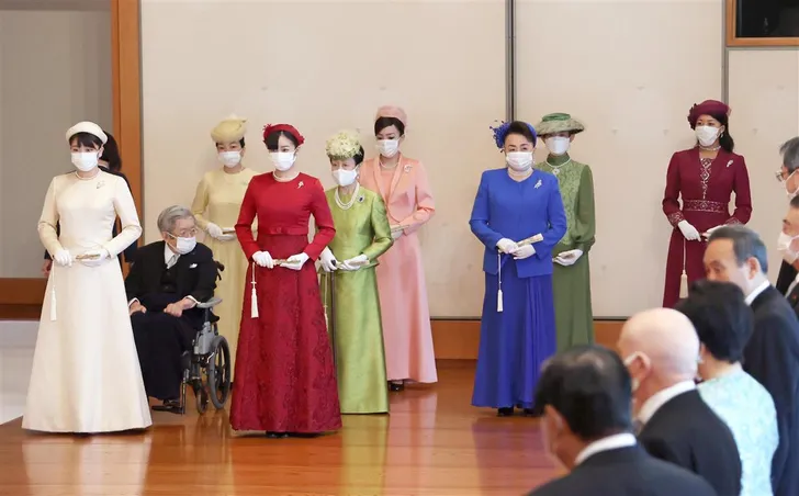 Het was voor Japanse begrippen best een kleurrijke bedoening, meestal kiezen de dames collectief voor crème of pastels. Achteraan: prinses Akiko en Yoko van Mikasa, prinses Takamako (Hisako) en prinses Tsuguko. In het midden prins Hitachi (Masahito), prinses Hanako, prinses Tomohito (Nobuko) van Mikasa. Eerste rij: prinsessen Mako en Kako, dochters van nieuwe kroonprins Akishino.