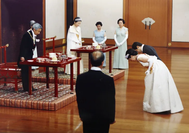 Ze verloofden zich in januari 1993 en trouwden op 9 juni in de Kashiko-dokoro, de Shinto tempel van Amaterasum (de zonnegodin) op het terrein van het keizerlijk paleis in Tokio. Het was een traditionele ceremonie: Masako's lichaam werd gereinigd volgens een oud ritueel voordat hofdames haar kleedden in een juni-hitoe, een outfit van twaalf lagen. Het duurde drie uur voor ze de kimono van 15 kilo aanhad, het gewaad kostte ruim 278.000 euro. Ook haar kapsel kostte uren, er moesten lange strengen kunsthaar in worden verwerkt. Ook Naruhito droeg traditionele robes, de kledingstijl stamde uit het Heian Tijdperk (794-1185).