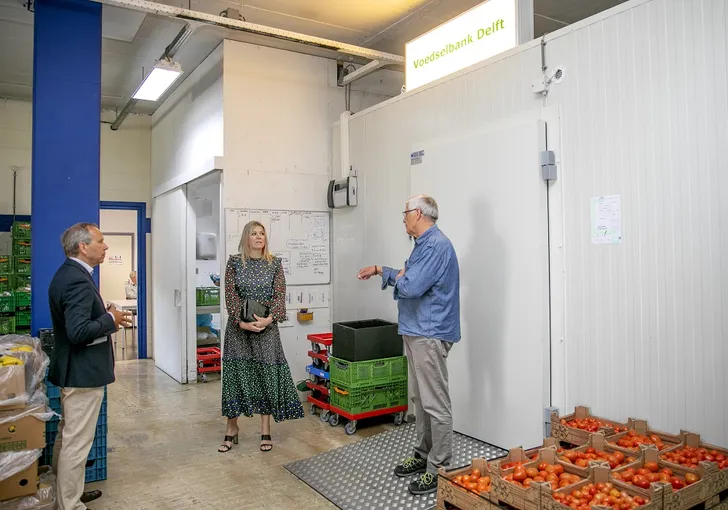 Koningin Máxima heeft een trapezejurk met lange mouw. Muiltjes van Zara maken de look af.