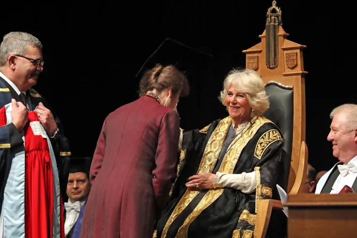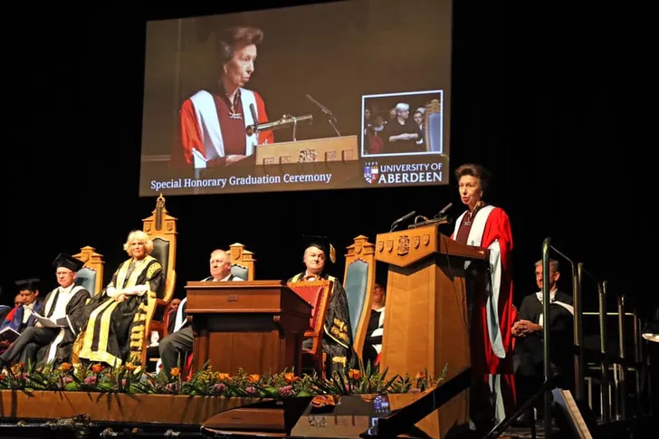 Prinses Anne kreeg op de universiteit van Aberdeen een eredoctoraat uitgereikt van Camilla, die ter plekke de titel hertogin van Rothesay draagt. Ze waren er allebei een beetje giechelig onder, onder de stiff upperlip, uiteraard.