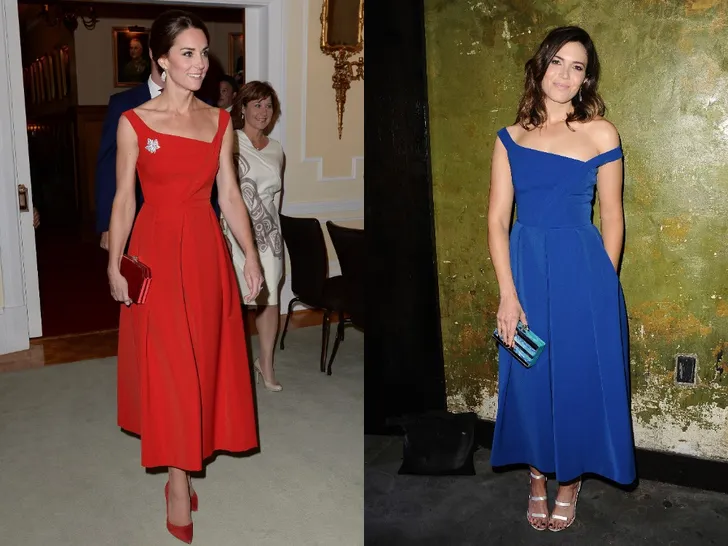 Stralend ging actrice Mandy Moore (van de populaire serie This Is Us) vorige week de rode loper op in een beauty van een jurk van Preen. Een jurk die Kate een jaar eerder al droeg, tijdens een bezoek aan Canada. Of Mandy wist dat ze Kate kopiërde, is niet bekend. Ze is in elk geval niet de enige Hollywood-ster die de duchess al eens (bewust of onbewust) nadeed.
