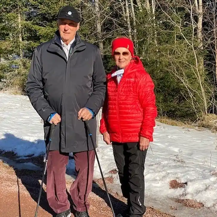 Koningin Sonja en hij zijn niet ziek en deelden een kiekje van een wandeling in hun zelfisolatie.