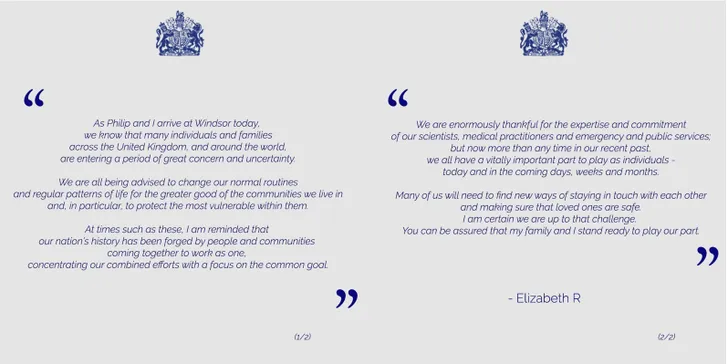 ...net als koning Filip van België. Hij zei onder andere: "Mathilde en ik denken aan ieder van jullie, vooral aan jullie die door de ziekte zijn getroffen. We denken aan u, onze ouderlingen, die zich geïsoleerd voelen, gescheiden van uw dierbaren. Aan jullie ouders die ertoe worden geleid jullie te reorganiseren. En aan jullie jongeren van wie we verantwoordelijk gedrag verwachten. Onze houding is essentieel. We kunnen levens redden (...) de huidige situatie herinnert ons aan onze kwetsbaarheid, maar toont ook onze kracht. De spontane gebaren van vrijgevigheid en solidariteit die de afgelopen dagen zijn vermenigvuldigd, maken me warm in het hart. Ik moedig ze aan. Ieder van ons heeft een rol te spelen bij het overwinnen van deze crisis. Ik heb er vertrouwen in dat we uit deze beproeving zullen groeien."