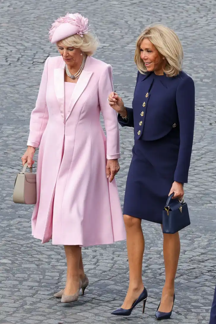 Camilla zorgde voor een beetje kleur met een roze wollen coat dress van Fiona Claire en een dolle hoed van Philip Treacy, die qua wind wel een extra elastiekje dan wel hoedenspeld had kunnen gebruiken. Het taupe tasje van Charlotte Elizabeth deed de outfit geen goed, maar dat heb je met taupe. First Lady Brigitte Macron was beeldschoon in bleu, in een pakje met ankerknopen. We speuren nog even naar het label.