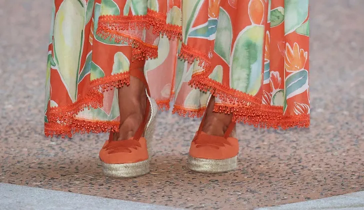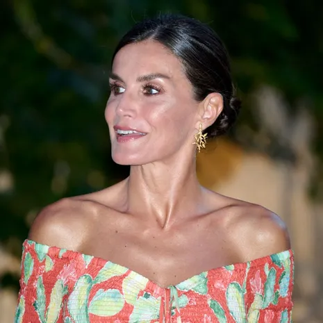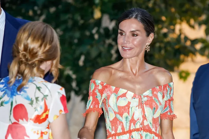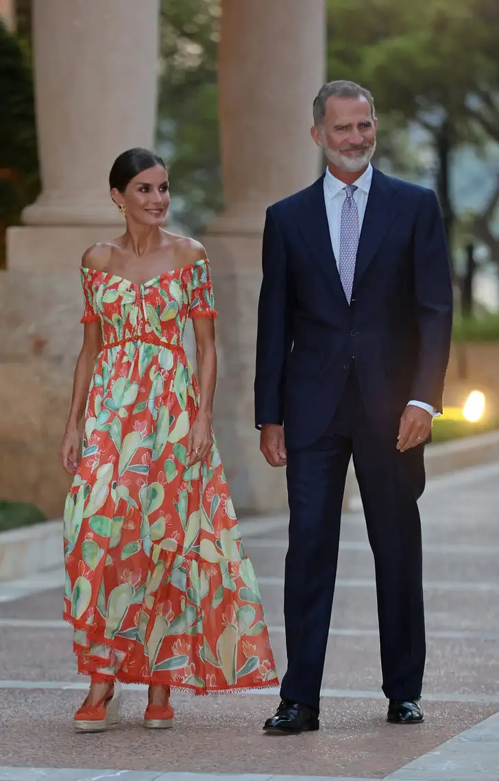 Koning Felipe droeg een fraai donkerblauw pak, koningin Letizia een heerlijke off the shoulder jurk van Charo Ruiz Ibiza, met haar Calzados Picon espadrilles met sleehakken, schoenen waar ze momenteel op kan worden uitgetekend - ze heeft ze in vele kleuren.