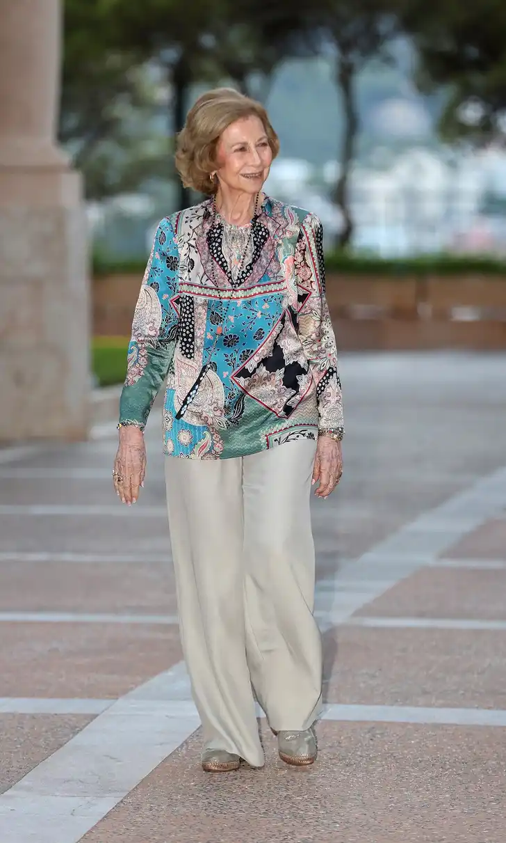 Oud-koningin Sofia was ook van de partij en het levende bewijs dat je op zekere leeftijd echt kleur moet omarmen. Niet alleen is deze rommelige top ondanks de patronen aan de fletse kant, de look was zoveel sterker geweest met een donkerblauwe broek, in plaats van deze beige…