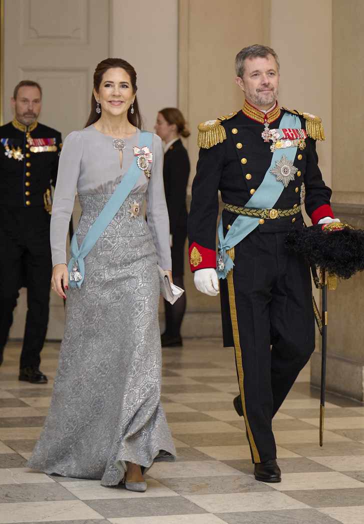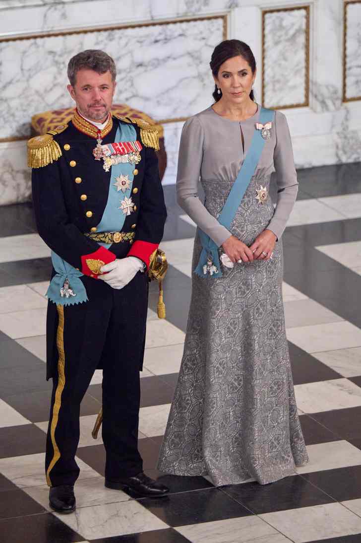 Voor de gelegenheid ging Frederik dan ook gekleed in z'n gala-uniform en straalde Mary in een betoverende, figuurflatterende jurk van Julie Fagerholdt. Het prachtige satijnen ontwerp schitterde in een zilveren kleur en had een tailleband met een verfijnd patroon dat de jurk extra bijzonder maakte.