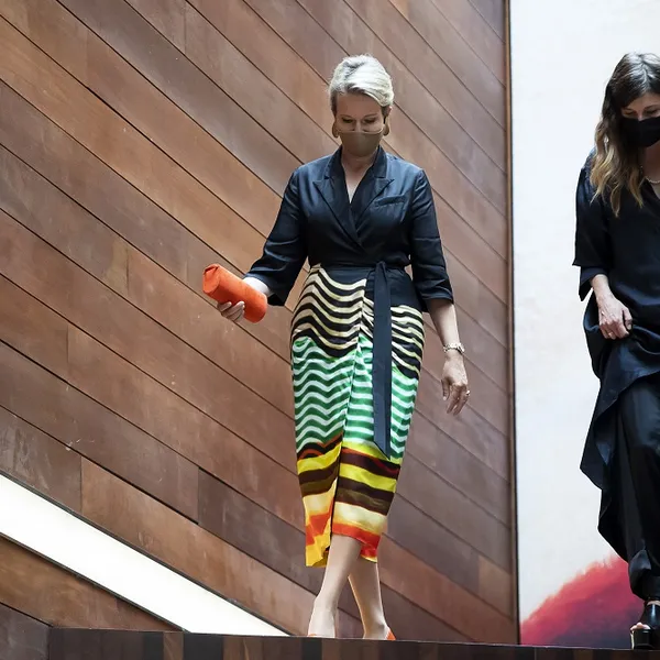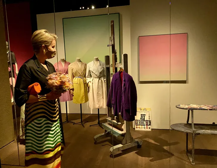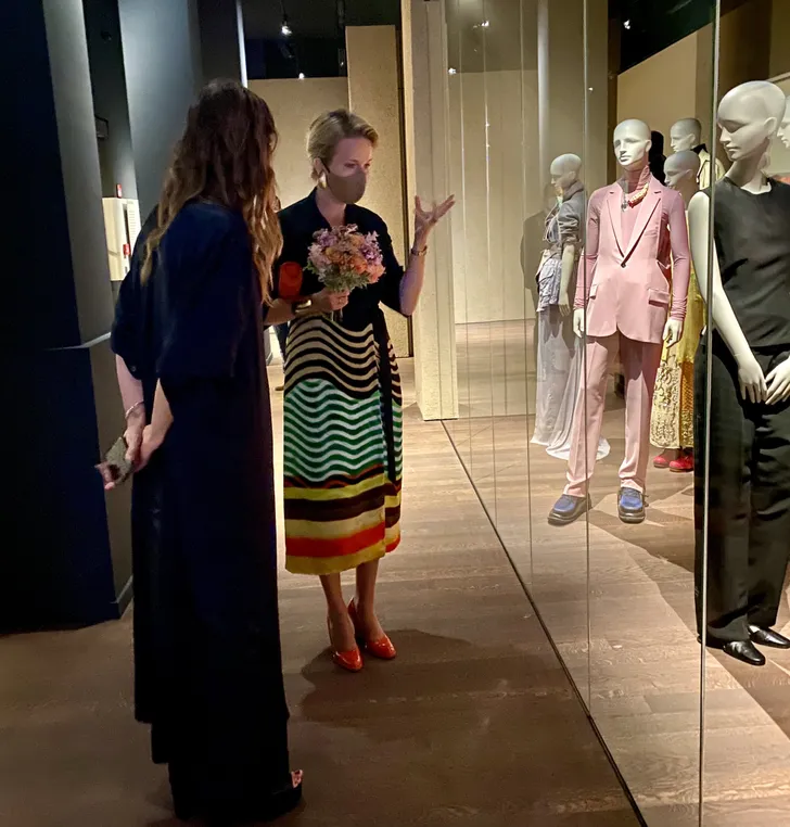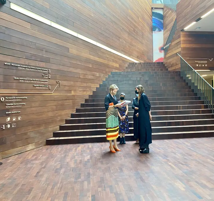 Mathilde kreeg een rondleiding van museumdirecteur Kaat Debo, sprak met betrokkenen en ze droeg heel toepasselijk een vrolijke look van Dries van Noten.