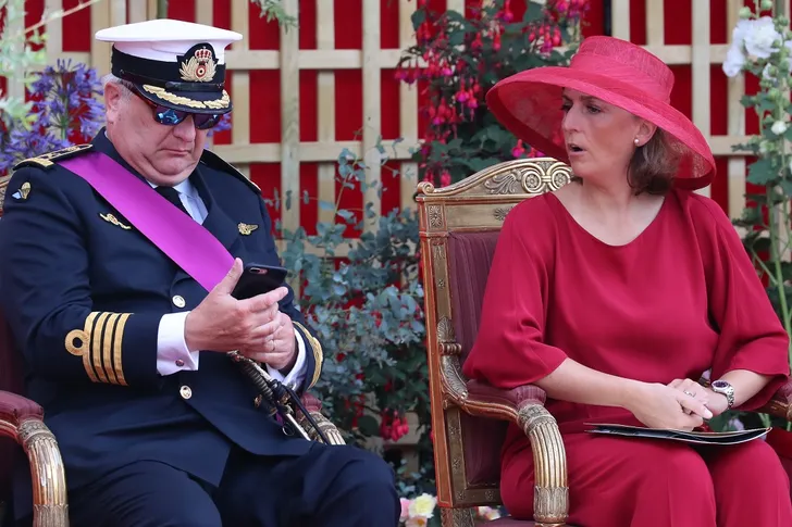 ...met prins Laurent en prinses Claire, in een vrolijk rood pak...