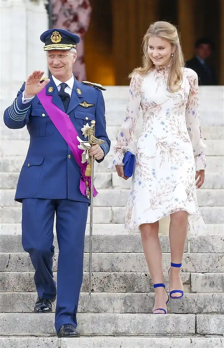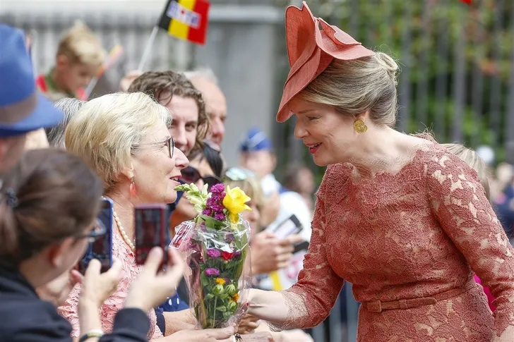 Koningin Mathilde en kroonprinses Elisabeth droegen allebei Natan. Hare Majesteit koos voor "een jurk met tailleriem in geborduurde guipure geglansd met zijde, met opstaande kraag en geknipte draden in de kleur terracotta," aldus Natans Edouard Vermeulen zelve.