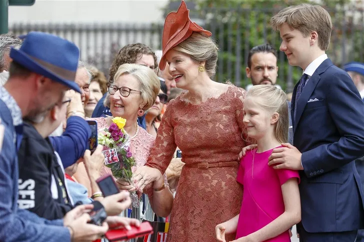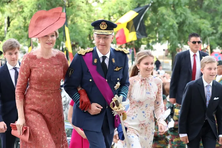 Arm-in-arm op de nationale feestdag: koningin Mathilde (op hoge hakken over de kasseien aan de kathedraal van Brussel) en prins Gabriël (in het gips na -vermoedelijk- een sportongeval). Naast hen loopt prinses Eléonore. pic.twitter.com/2qwAmkmxX6