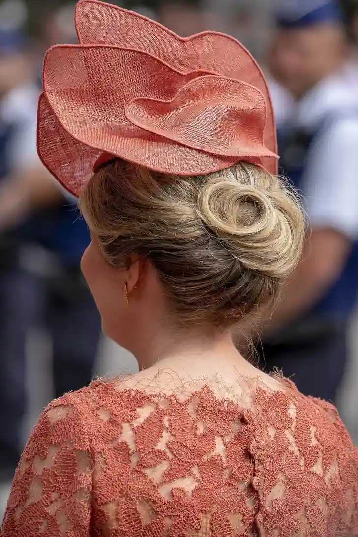 "Gemaakt van natuurlijke vezels in een kleur die past bij haar outfit", zegt Delvigne. "Geïnspireerd op het bladmotief op de kant van haar jurk." Ook over het kapsel was even nagedacht - beeldig.