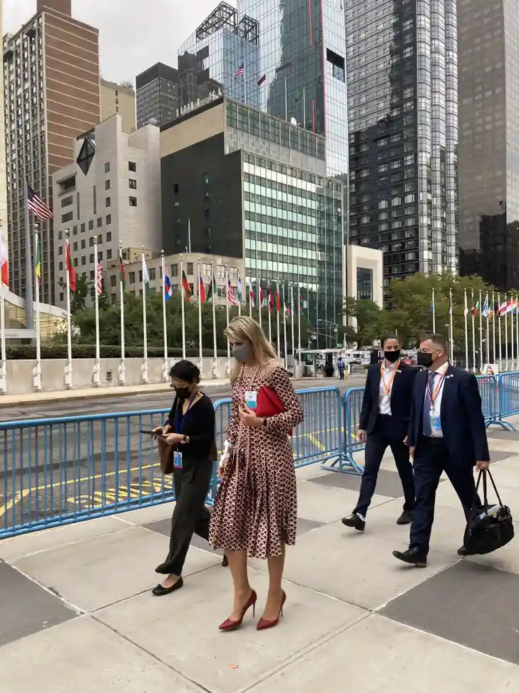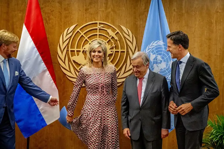 Koningin Máxima, de leesbril lekker in haar hals gestoken, heeft in New York persoonlijk haar jaarrapport kunnen aanbieden aan de secretaris-generaal van de Verenigde Naties, António Guterres.