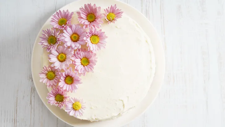 - Decoreer de cake met eetbare bloemen voor een extra royal randje.