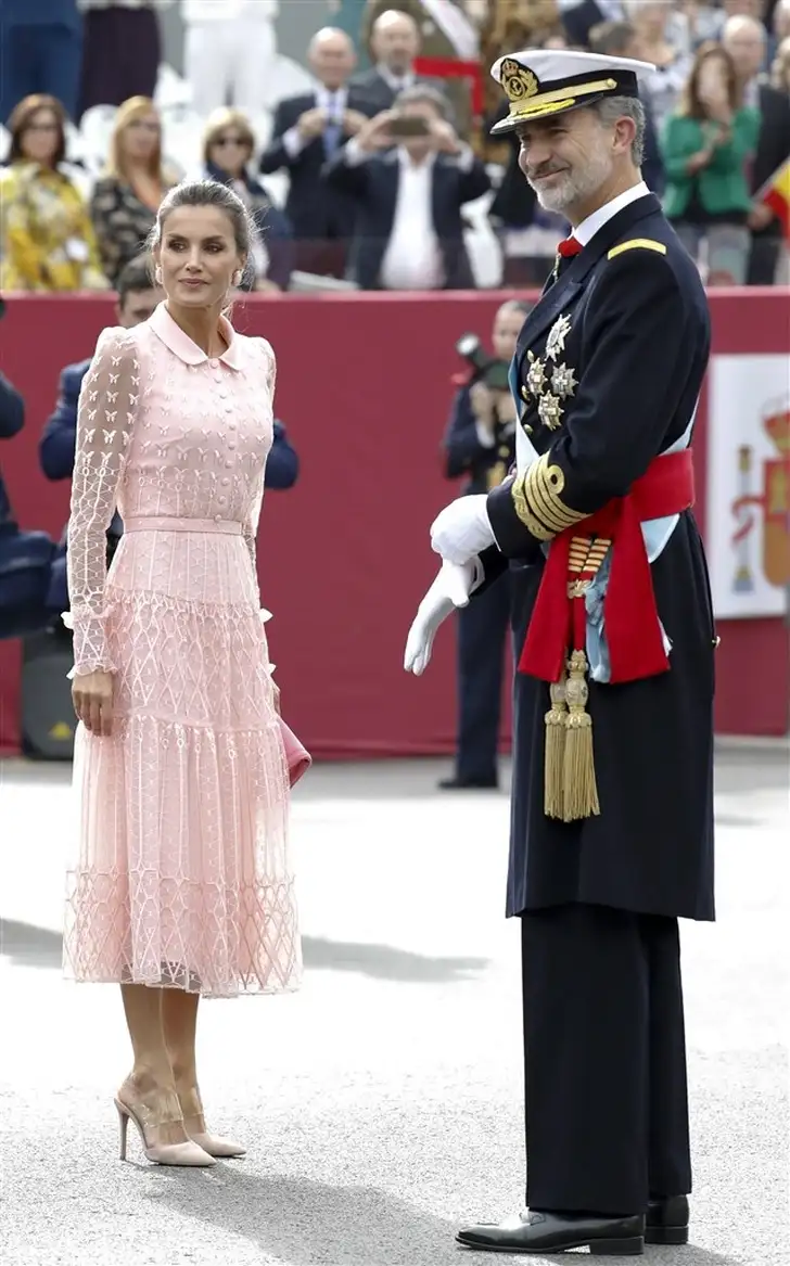 Letizia had besloten wat zachtheid tegenover al het wapengekletter te stellen: zelf droeg ze een Felipe Varela in de trendkleur blossom, geborduurd met vlinders. Het was een wat romantischere look dan we haar gewend zijn, maar beeldig. Erbij Steve Madden muiltjes en een clutch van Magrit en roze oorbellen die ze van haar schoonmoeder, oud-koningin Sofia, had geleend.