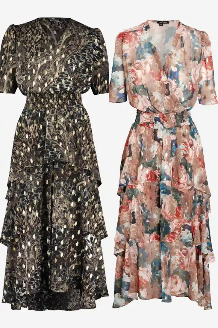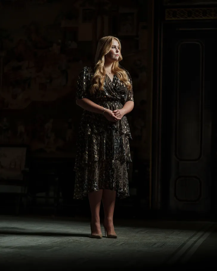 Gouden stippen, dierenprintje… dit is een op een dezelfde jurk die Amalia droeg op één van haar portretten voor haar achttiende verjaardag.
