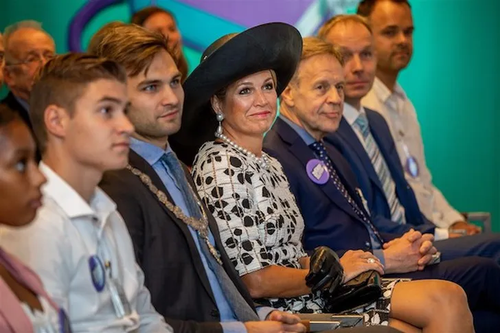 De koningin reisde af naar Utrecht om aanwezig te zijn bij de viering van veertig jaar De Kindertelefoon. En trok daarvoor deze opvallende look van Carolina Herrera uit de kast.