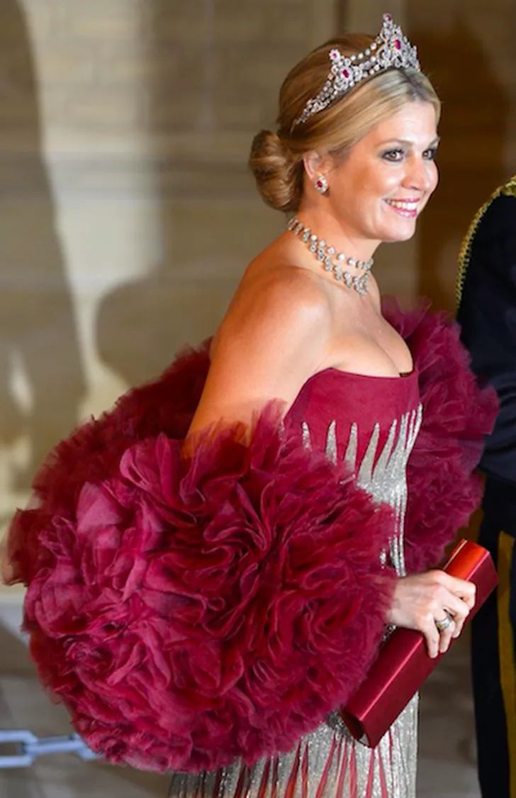 Koningin Máxima is ambassadrice van de Nederlandse mode en probeert daarom vaak creaties van Hollandse bodem te dragen. Daarom koos ze bijvoorbeeld op de vooravond van het huwelijk van de Luxemburgse erfgroothertog Guillaume in 2012 voor een prachtige rode japon met zilveren accenten. Wow!
