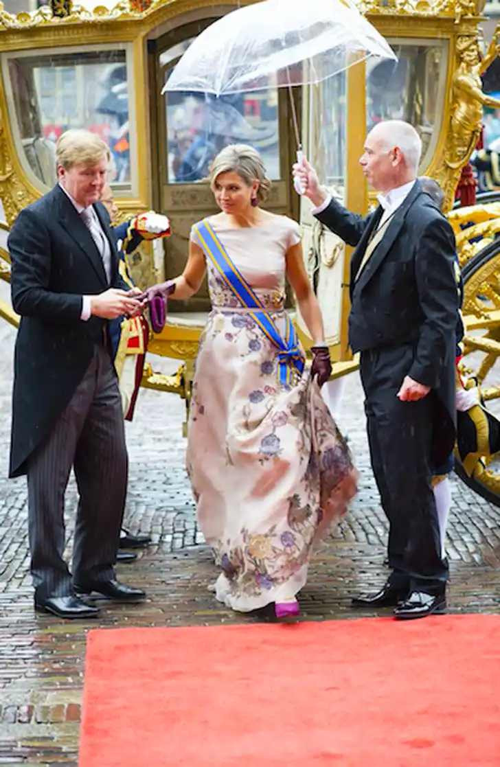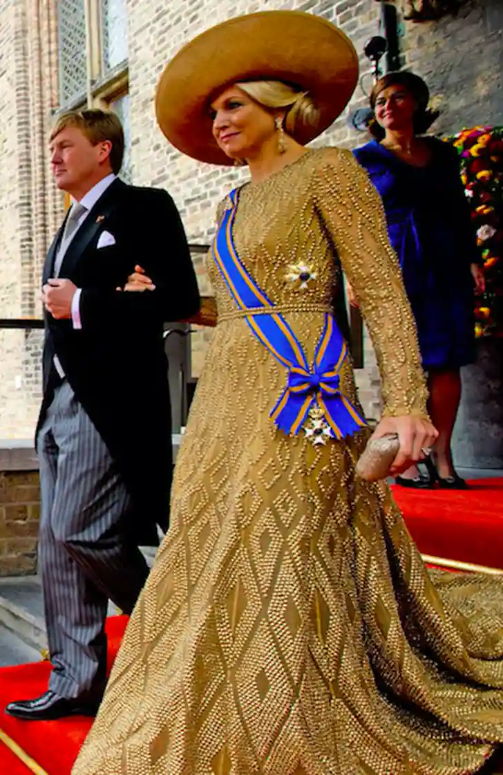 In 2013 schitterde Máxima letterlijk in een gouden va va voom japon. Ze droeg een goudkleurige jurk die is geborduurd in degradé wyber-patroon met transparante mouw en riempje in de taille.