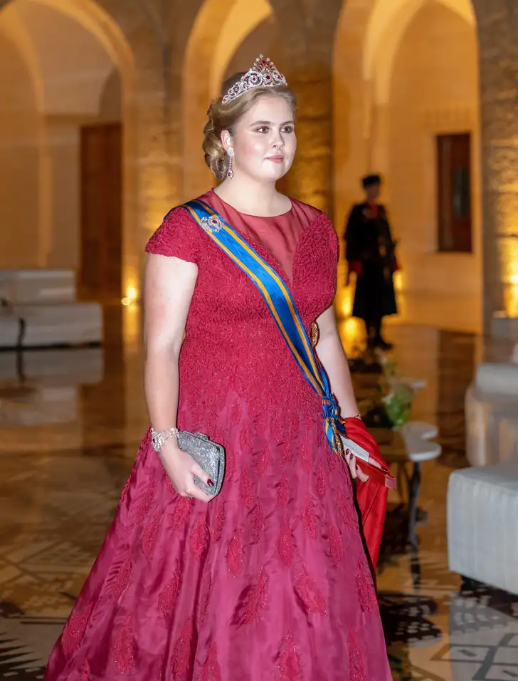 …en Amalia koos voor de rode Jan die ze liet maken voor haar eerste royal wedding, die van kroonprins Hussein van Jordanië en zijn Rajwa afgelopen juni.