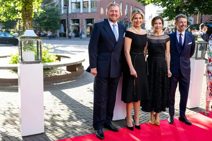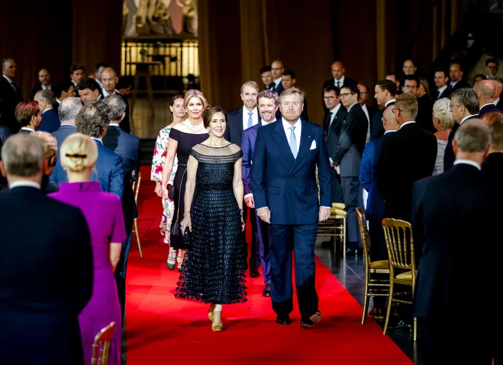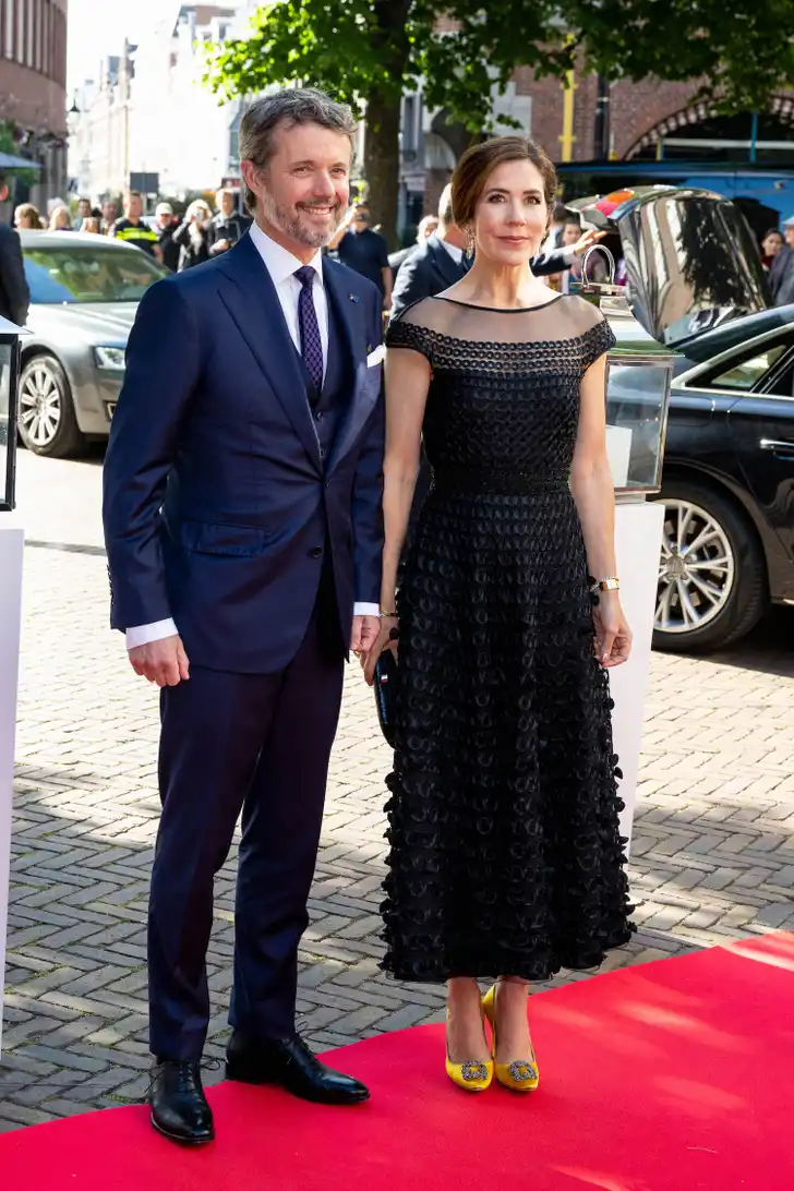 Voor de gelegenheid, dresscode cocktail, koos zowel Mary als Máxima een zwart jurkje uit, Máxima met als eyecatcher haar ketting, Mary met als leuk detail haar gele Carrie Bradshaw-pumps. Een plaatje, allebei. De heren koningen waren overigens al even color-coordinated.