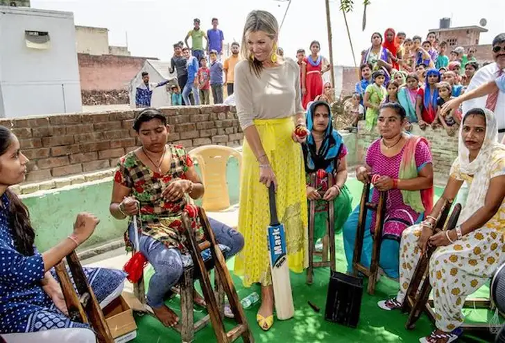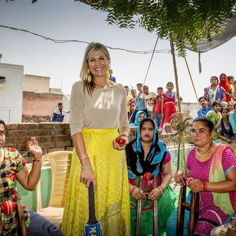 De koningin is in haar functie als speciale pleitbezorger voor de VN in India, om te praten over inclusieve financiering. Ze ontmoette vandaag onder andere vrouwen die rugbyballen maken.