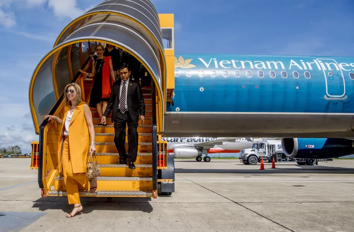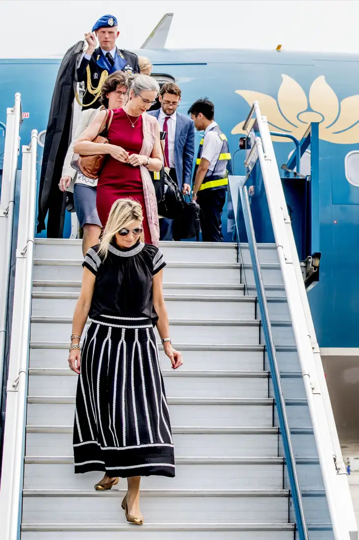 Maar ook met meer casual weet Máxima raad, zeker als ze 'in haar eentje' reist voor haar VN-werk. Dan is het werktas mee, zonnebril op en gaan. De twee looks hieronder waren in Vietnam in 2017...
