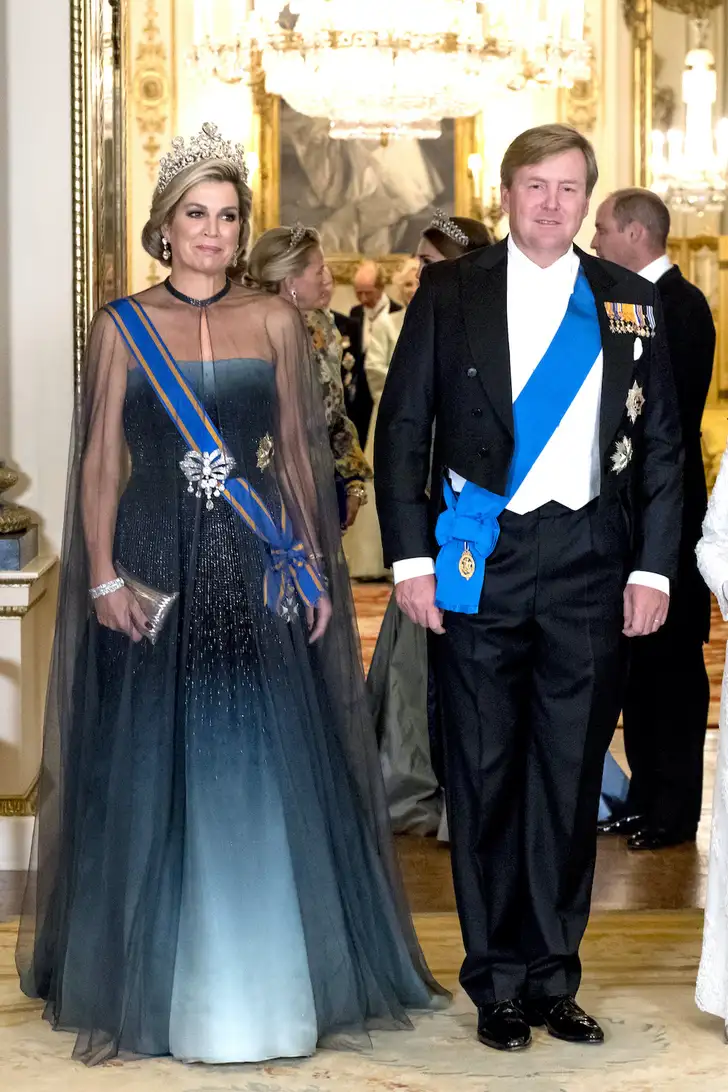 Máxima draagt voor de gelegenheid een Jan Taminiau die we in Nederland toch wel beroemd mogen noemen: het is de japon die ze ook droeg tijdens het staatsbanket in Buckingham Palace in 2018. Want voor dé Queen, trek je iets heel bijzonders uit de kast.