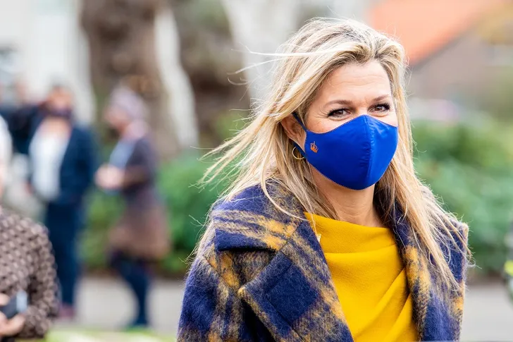 Máxima is duidelijk geen fan van mondkapjes, maar het smizen (= is lachen met je ogen) gaat haar inmiddels goed af en het koningsblauwe met het huismerk staat haar wat vriendelijker dan haar zwarte exemplaren.