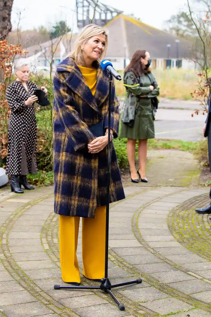 HM zit duidelijk in haar Ruiten Periode, vandaag dook ze op in Noordwijk in een vrolijk geel-blauw geruite jas met daaronder een diepgeel pak, beide van Natan.