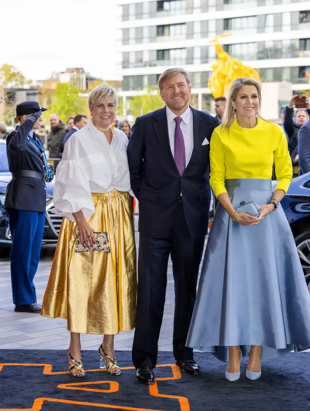 Prinses Laurentien ging eveneens voor een zwierige rok. Ze koos voor geelgoud in combinatie met een witte blouse met speelse pofmouw. De dames stylden de outfit af met pumps en clutch in dito kleur als hun rok.