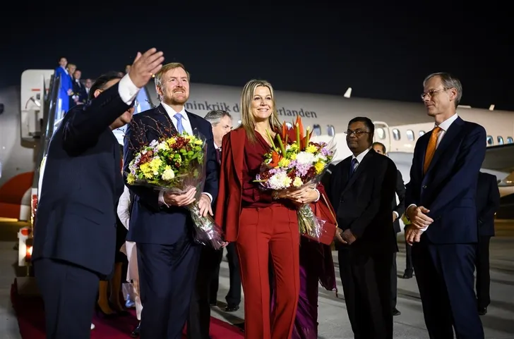 Bij de aankomst op het vliegveld van New Delhi zette Máxima meteen leuk de toon in een rood pak van Claes Iversen.