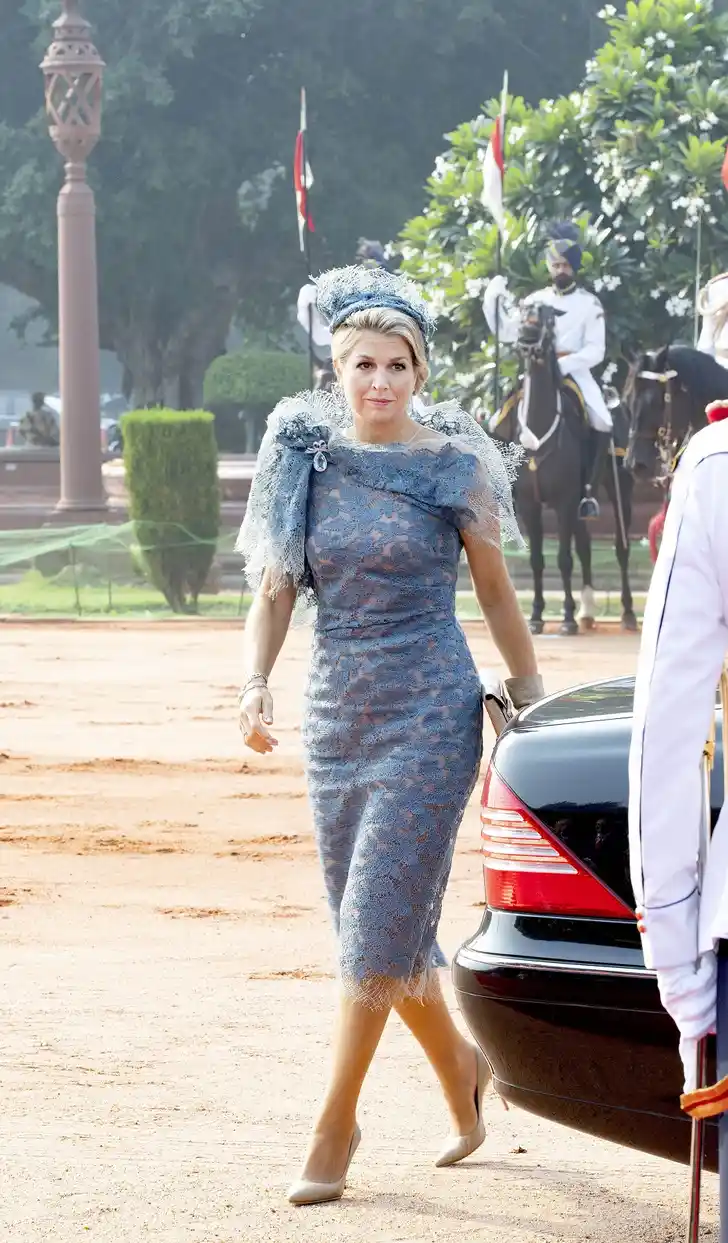 De eerste dag van een staatsbezoek is altijd de meest formele en Máxima ging dan ook sterk van start in matblauwe kant die aan de bovenkant wat om haar heen wolkte. Het betrof een ontwerp van Natan.