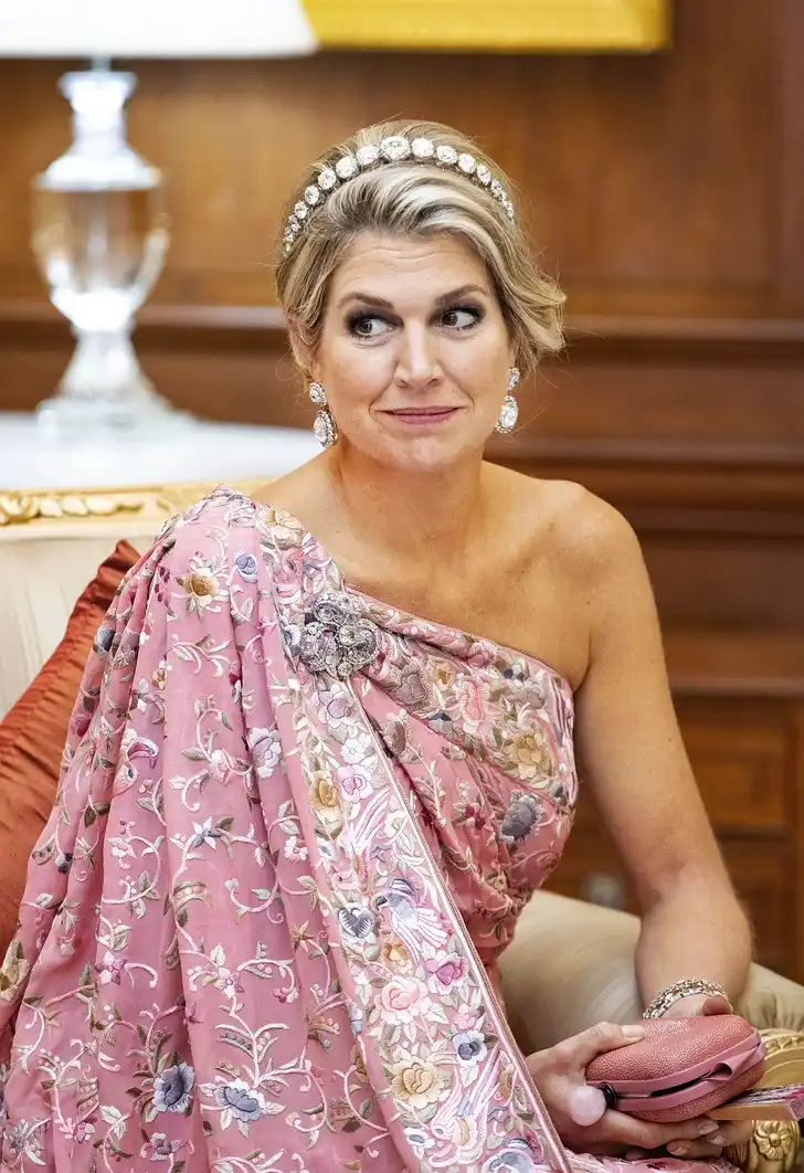 Het onbetwiste fashion hoogtepunt van deze Royal Tour was de roze sari die Máxima droeg tijdens het staatsdiner. De stof kocht ze twaalf jaar geleden zelf in Jaipur, tijdens een staatsbezoek waarop ze als prinses haar schoonmoeder, toen nog koningin Beatrix, vergezelde.