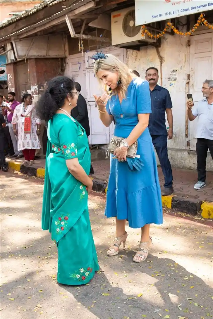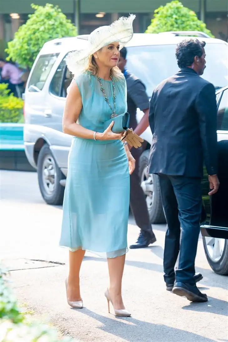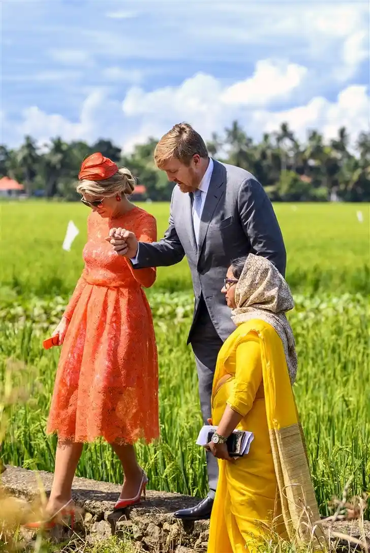 Van het afscheid van India in Alleppey maakte HM een mooie oranje finale in een kanten Natan met een zedige witte onderjurk en oranje accessoires. Het was weer Máximaal, Majesteit!