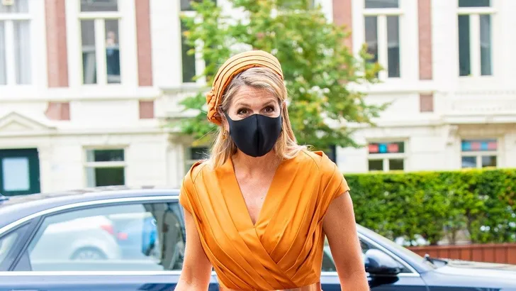 … maar inmiddels heeft ze het iets beter zittende stoffen exemplaar omarmd: even in de was is wel zo duurzaam als steeds een nieuwe, met het oog op de niet aflatende maatregelen. Ze droeg 'm bij een rewear van de ravissante Mattijs van Bergen in oranje. Erbij een soort haarband van Fabienne Delvigne en goudkleurige hakken van Gianvito Rossi. Ze droeg het geheel ook al eens in 2014, tijdens een staatbezoek aan Japan.