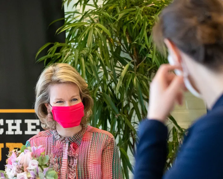 Queen van het Modieuze mondkapje is echter koningin Mathilde van België die er al maanden beeldig matchend bijloopt.